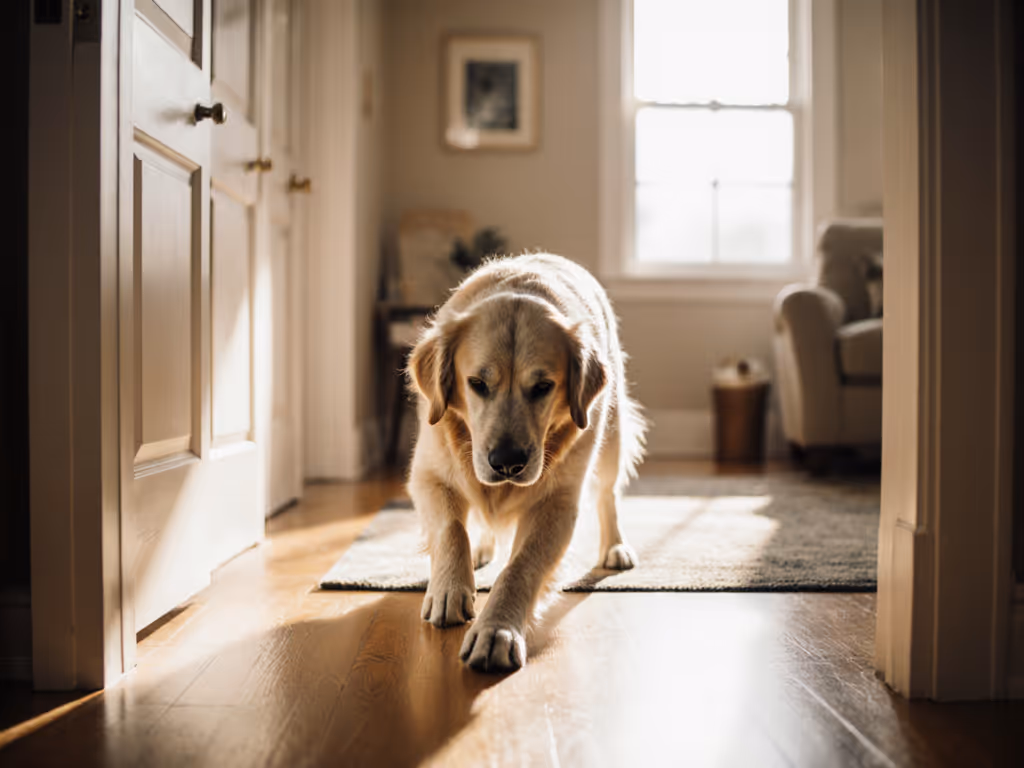 - Stage Gate 3: Extend to 5 minutes including two door thresholds (e.g., kitchen to living room). Goal: Pause-and-release through doorways without brace-pawing.