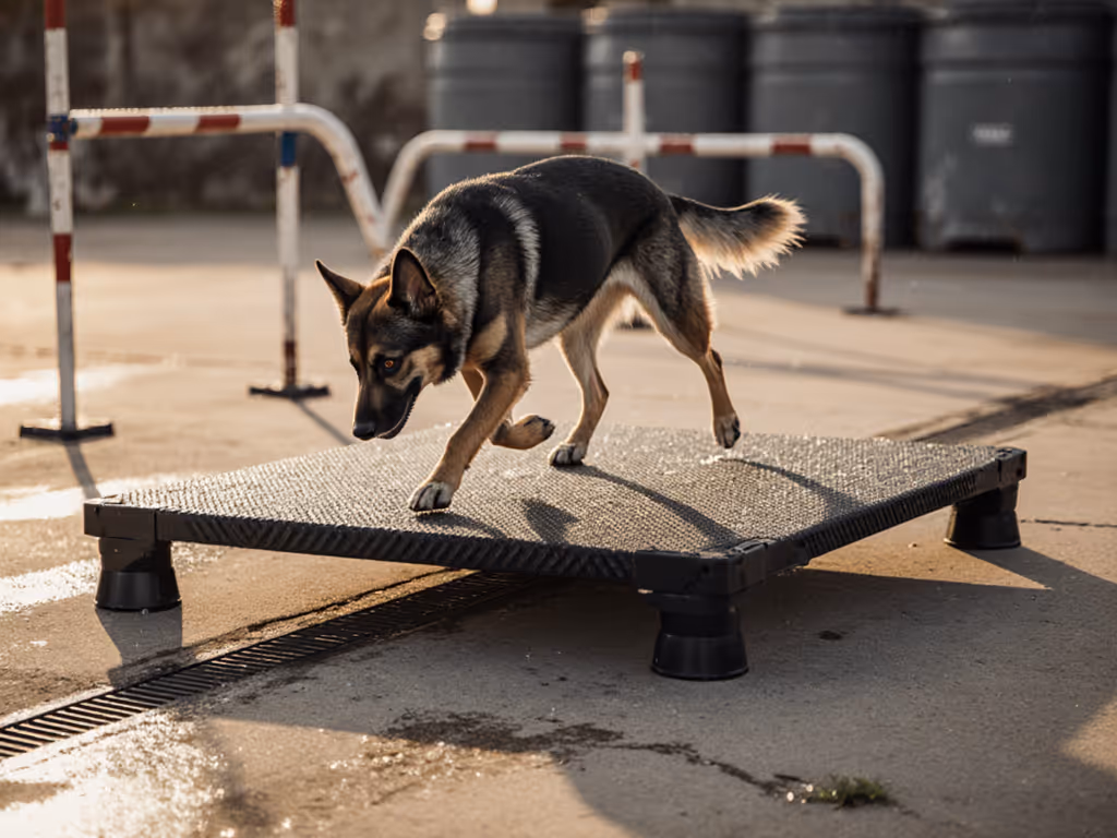 Handler and canine safety margins. Does the platform have edges that trip? Gaps that catch paws? Seams that catch harnesses? Walk it barefoot and in wet socks.